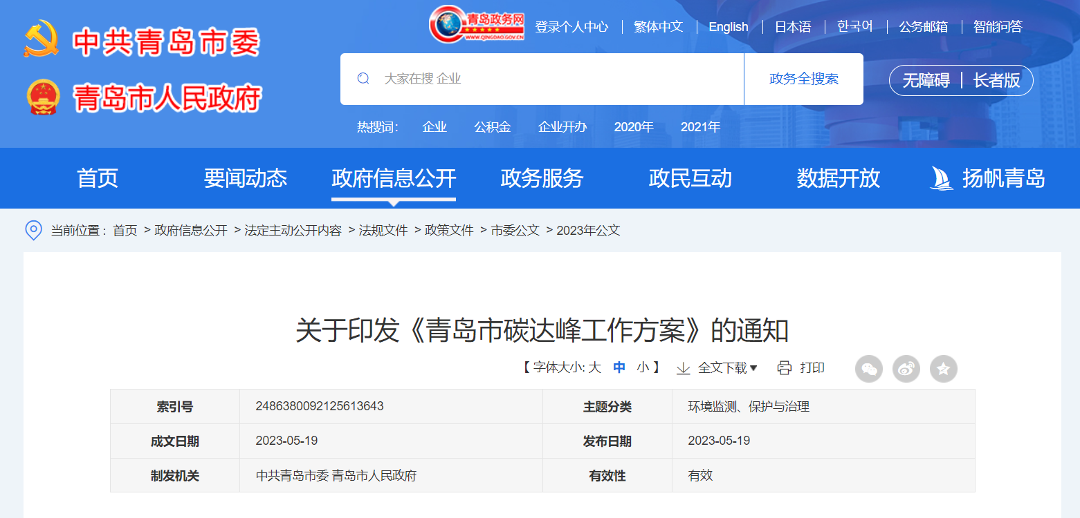 03.山东省青岛市发布《青岛市碳达峰工作方案》(2023.05.19)