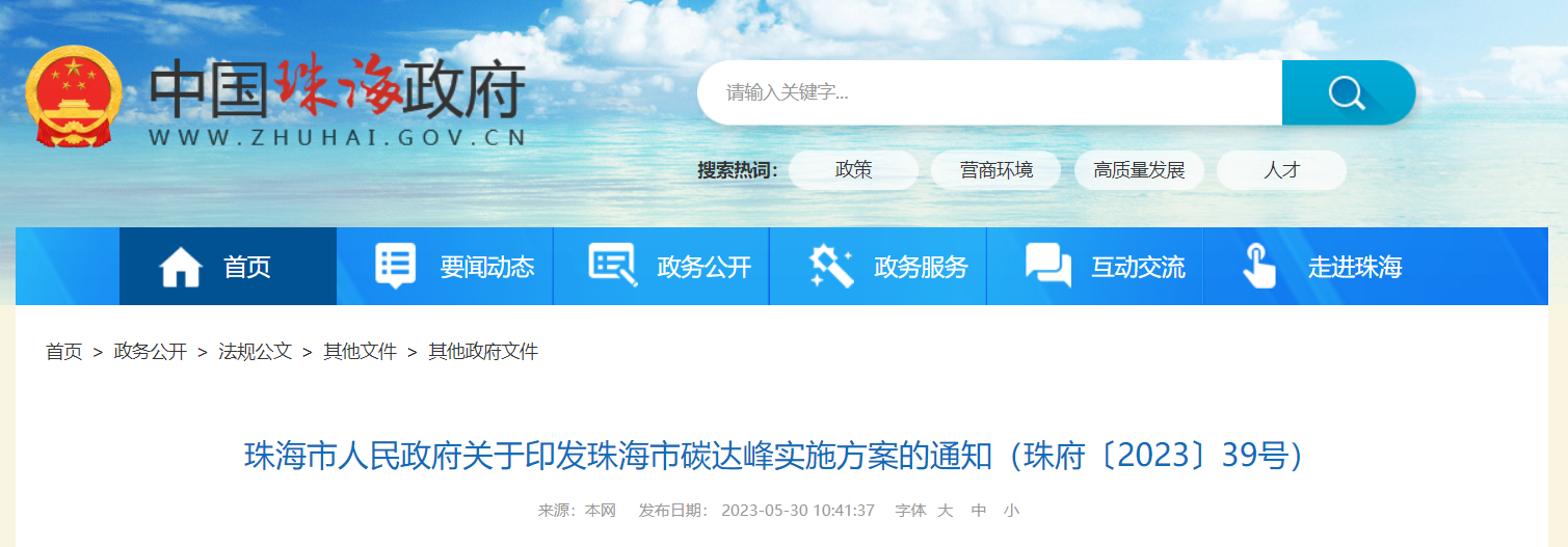 06.广东省珠海市发布《珠海市碳达峰实施方案》(2023.05.30)