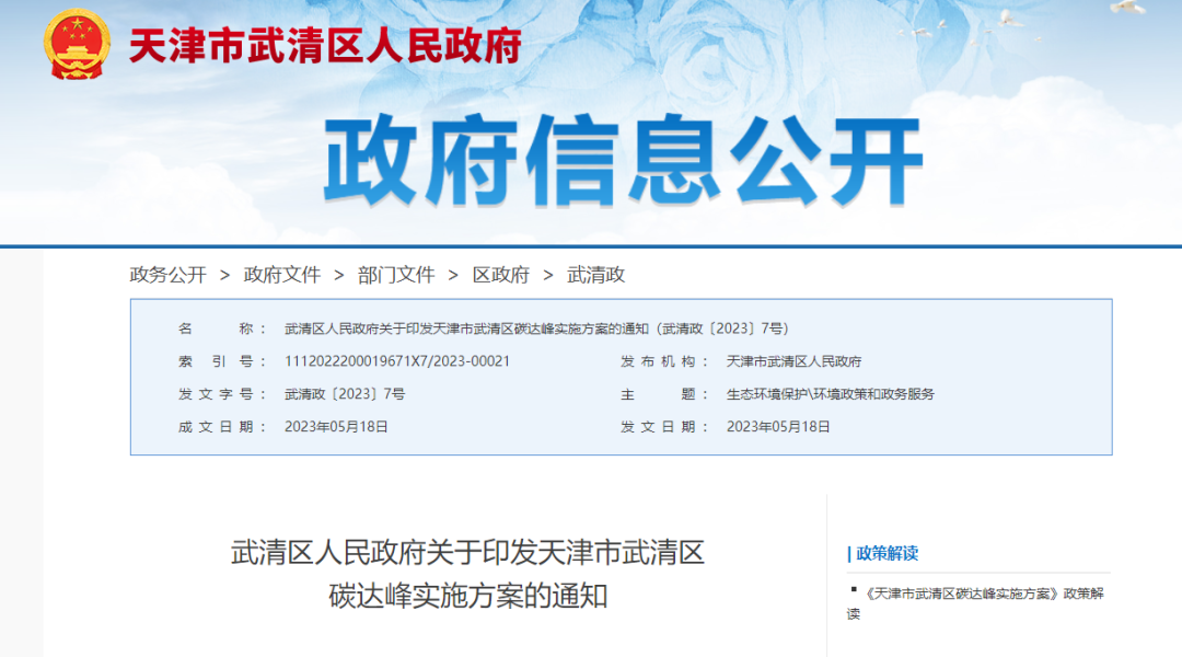 2.《天津市武清区碳达峰实施方案》