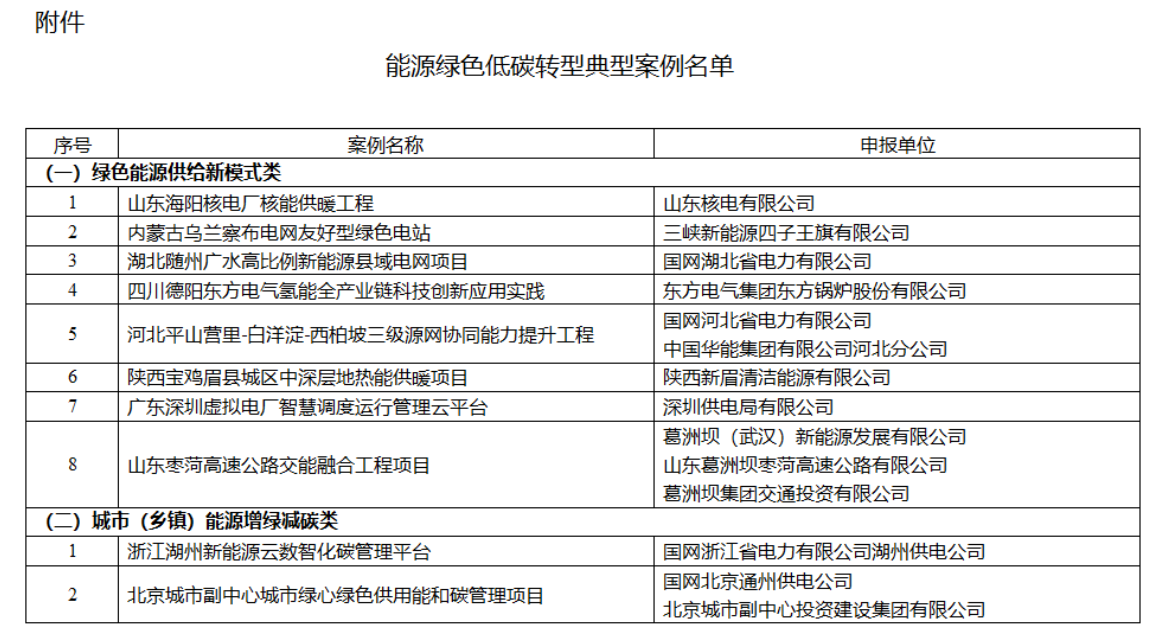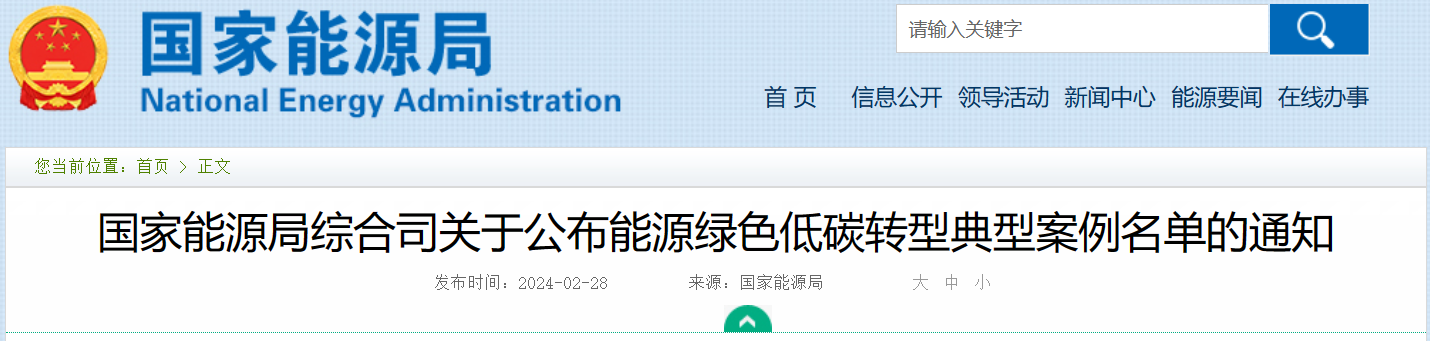 2月28日,国家能源局发布《关于公布能源绿色低碳转型典型案例名单的通知》。