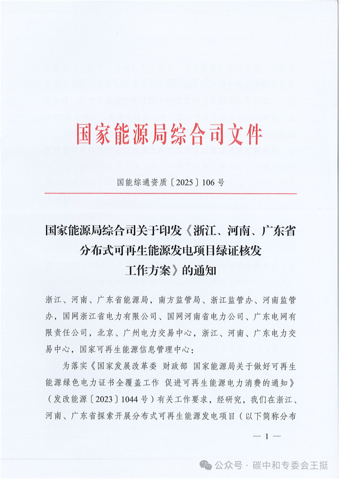 国家能源局综合司关于印发《浙江、河南、广东省分布式可再生能源发电项目绿证核发工作方案》的通知